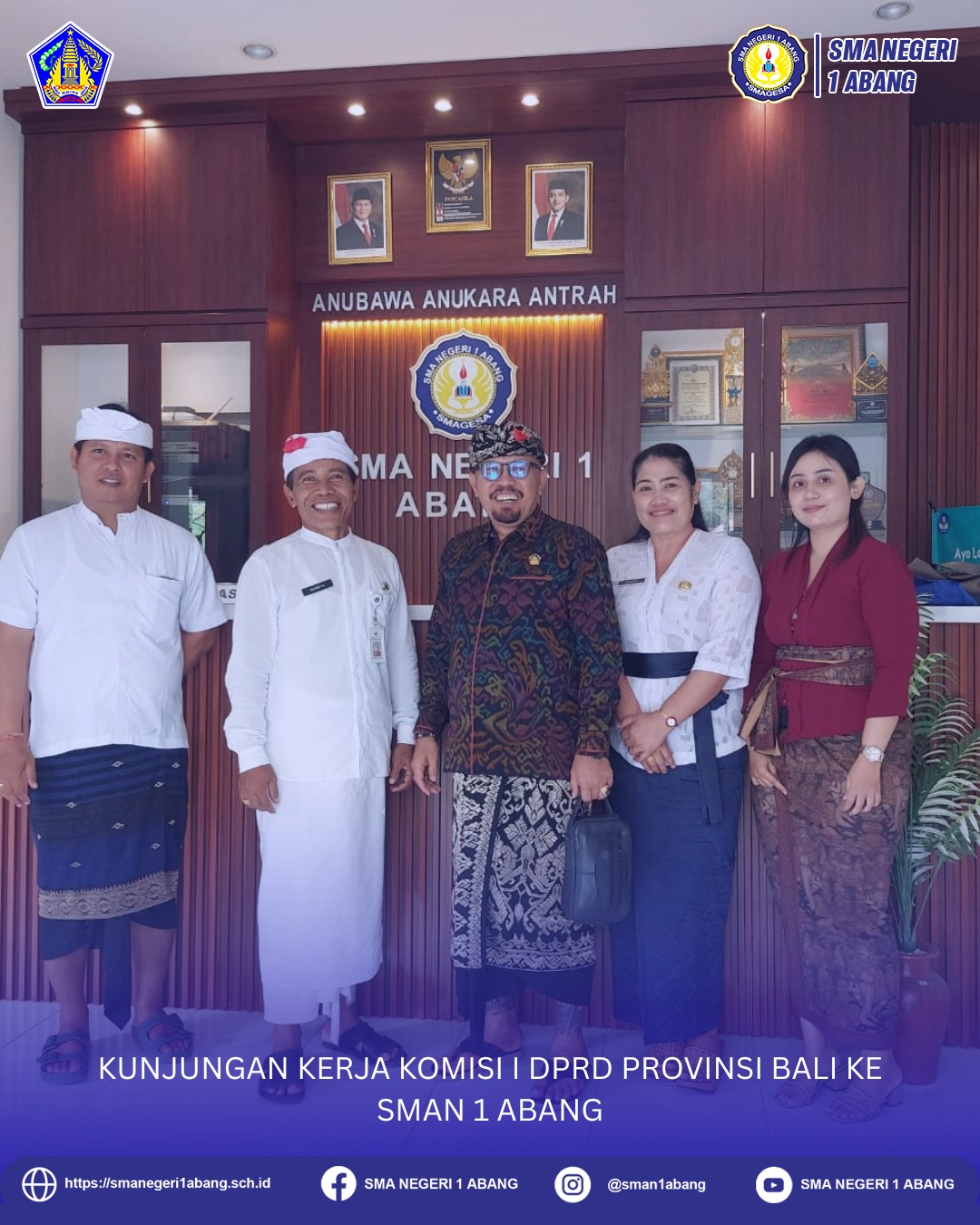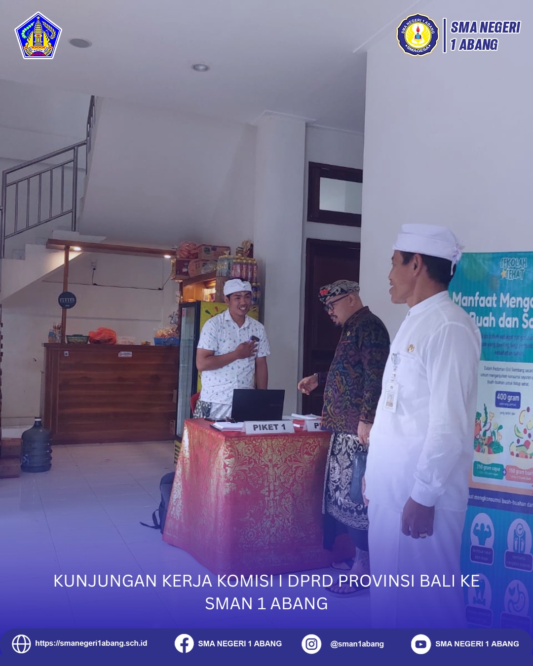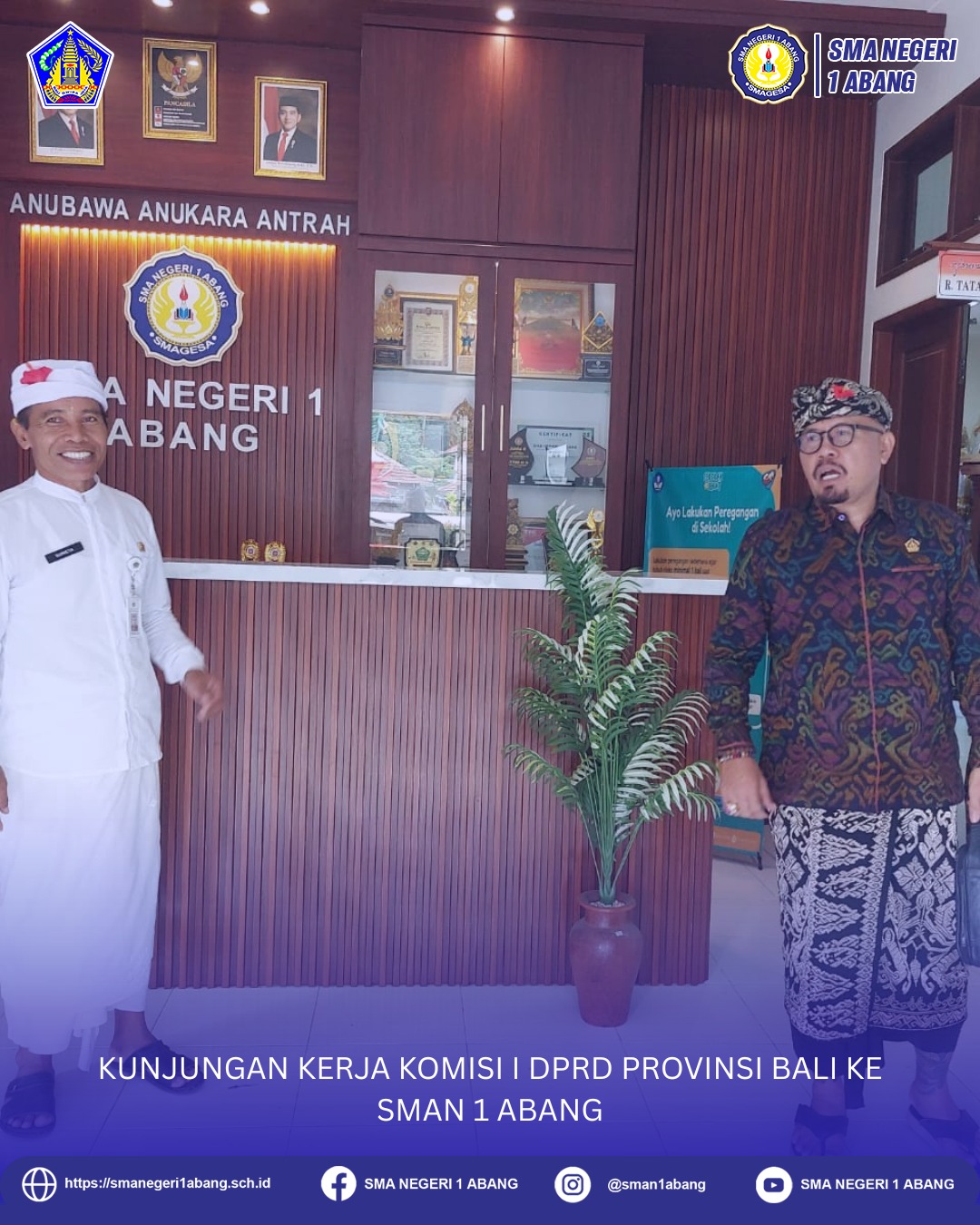 Abang — Dalam rangka pelaksanaan tugas pengawasan terhadap kebijakan daerah, Komisi I DPRD Provinsi Bali melaksanakan kunjungan kerja ke SMA Negeri 1 Abang, Kabupaten Karangasem, pada Selasa, 21 Oktober 2025 pukul 10.00 WITA.