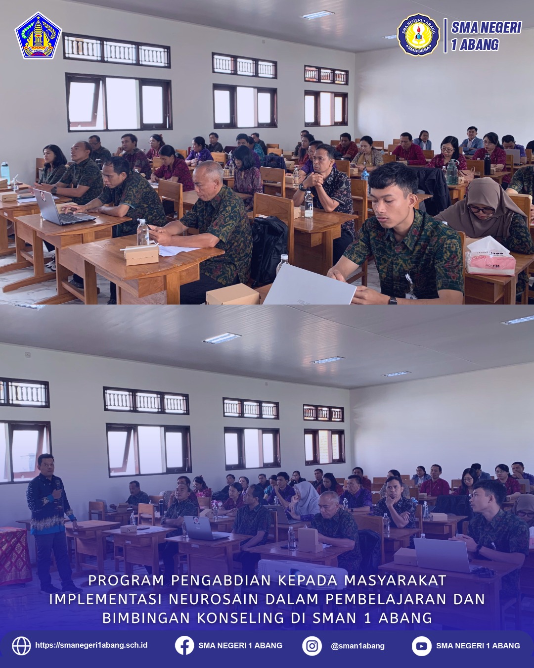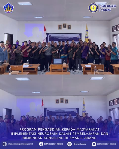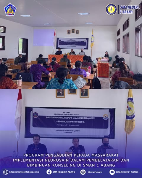Abang, 29 Agustus 2025 – SMAN 1 Abang menggelar acara pembukaan Program Pengabdian kepada Masyarakat (PKM) Implementasi Neurosain dalam Pembelajaran dan Bimbingan Konseling, bekerja sama dengan Tim PKM Universitas Pendidikan Ganesha (Undiksha). Kegiatan ini diikuti oleh para guru dari tiga sekolah yang telah menandatangani nota kesepahaman (MoU), yakni SMAN 1 Abang, SMAS Swastyastu Abang, dan SMKN 1 Abang.
