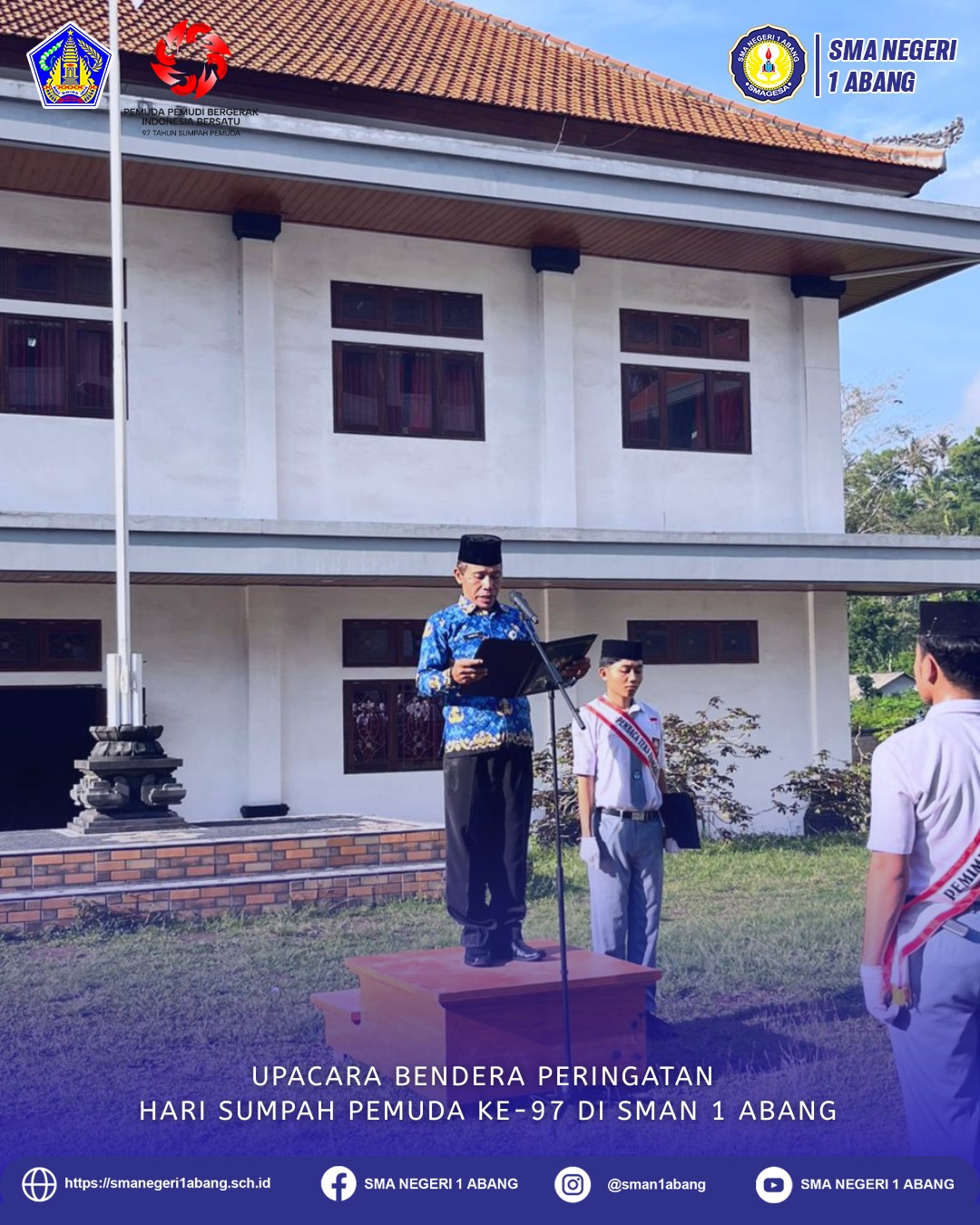 Bertindak selaku pembina upacara adalah Bapak Kepala SMAN 1 Abang, yang dalam amanatnya membacakan Keputusan Kerapatan Pemuda Indonesia 28 Oktober 1928, sebagai pengingat semangat persatuan, perjuangan, dan tekad para pemuda dalam mewujudkan kemerdekaan Indonesia.